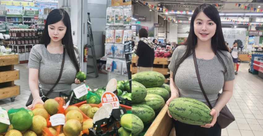 最近天氣漸漸變熱,也快要到西瓜的季節了,最近網路上流傳一組正妹在超市選購水果的照片,只是畫面中的正妹雖然穿著普通T-Shirt,但胸前飽滿的乳量根本遮不住,包緊緊也看得出來很巨,光看就能知道比西瓜還大!